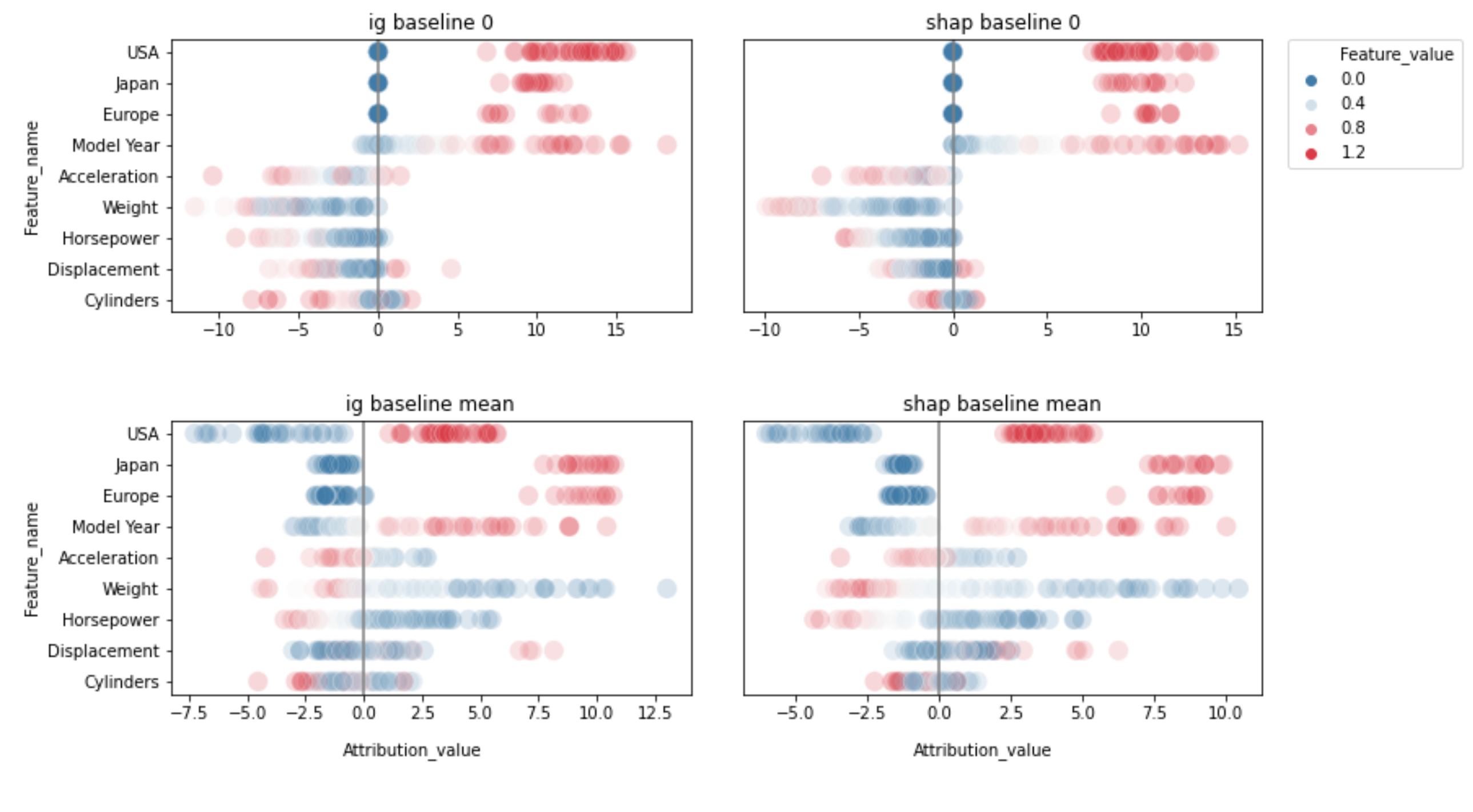 | The diagrams show how high and low values of features are distributed across the range of attributions assigned by IG and SHAP for various baselines. For some features, high values of the feature (in red) correlate with high values of attributions (x-axis), for some, they gather in the lower range or there is no clear correlation. |